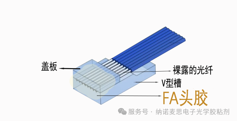 FA頭膠,用于粘接光纖、V型槽和蓋板。該類膠水有著嚴格的技術(shù)要求,包括低粘度、粘接力、固化后折射率、高Tg點溫度、低揮發(fā)性、低固化收縮率、低熱膨脹系數(shù)(CTE)、可靠性、信賴性要求。