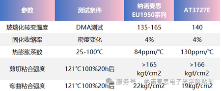 對比進口品牌AT3727E,納諾麥思EU1950系列膠水的熱膨脹系數(shù)和彎曲粘合強度甚至更優(yōu)。通過努力,該款膠水已經(jīng)在一些廠家實現(xiàn)量產(chǎn),并形成了一套成熟的點膠、固化參數(shù)以及質(zhì)量控制方法,詳見FA頭膠國產(chǎn)替代,勢在必行