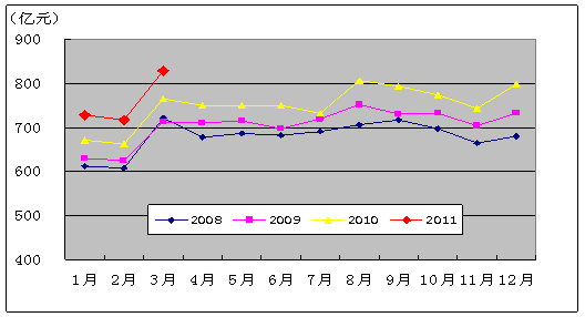 圖1. 2008-2011年各月電信主營業(yè)務收入比較