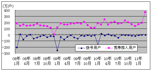 圖2. 2008-2011年移動電話用戶各月凈增比較