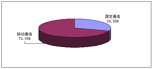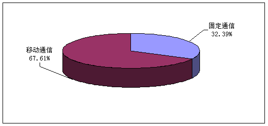 2011年1-3月,移動通信收入累計完成1591.7億元,比上年同期增長13.3%,在電信主營業(yè)務收入中所占的比重從上年同期的67.61%上升到70.05%;固定通信收入累計完成680.6億元,比上年同期增長1.2%,在電信主營業(yè)務收入中所占的比重從上年同期的32.39%下降到29.95%。
