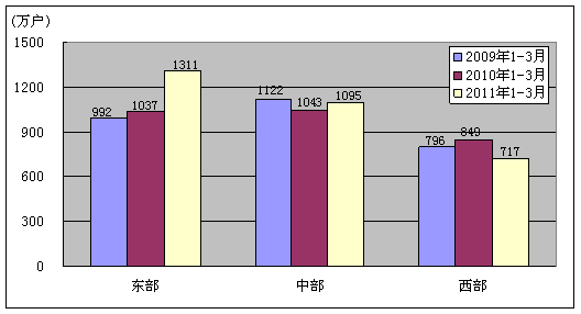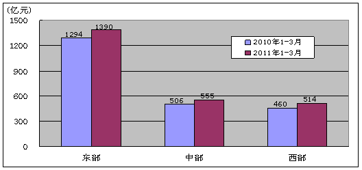 2011年1-3月,東、中、西部地區(qū)電信主營業(yè)務收入比上年同期分別增長7.4%、9.6%、11.9%。