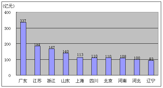 圖8. 2011年1-3月電信主營業(yè)務收入排名前十名的省份