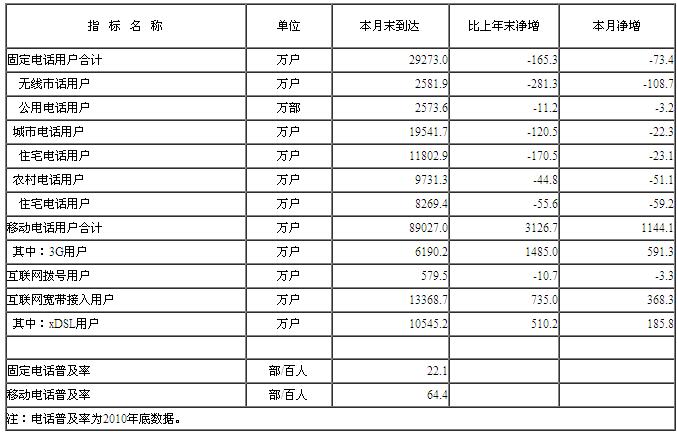 2011年3月,全國電話用戶凈增1070.7萬戶,總數(shù)達到118300.1萬戶。其中,移動電話用戶凈增1144.1萬戶。