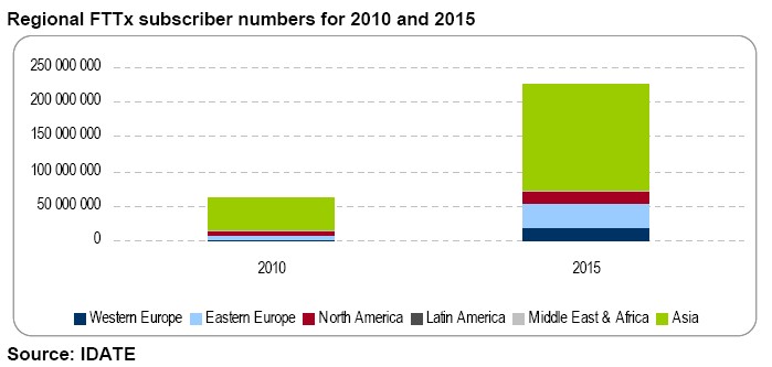 這一增長勢頭預計將導致未來五年光纖到戶家庭覆蓋數(Homes Passed)大幅上升:到2015年底,全球FTTH/B家庭覆蓋數預計將接近4.93億,其中超過一半將仍在亞洲市場,15%會在西歐地區(qū)。而全球FTTH/B用戶將達到2.27億。