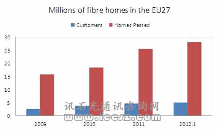 在光纖接入方面,歐洲運(yùn)營(yíng)商一定程度上都在投資光纖接入,用戶數(shù)也在不斷地增加,已經(jīng)從開(kāi)始主要的聚集點(diǎn),發(fā)展到高檔區(qū)、城鎮(zhèn)、部分鄉(xiāng)村和新建筑物等,但光纖寬帶接入速度仍然較慢。