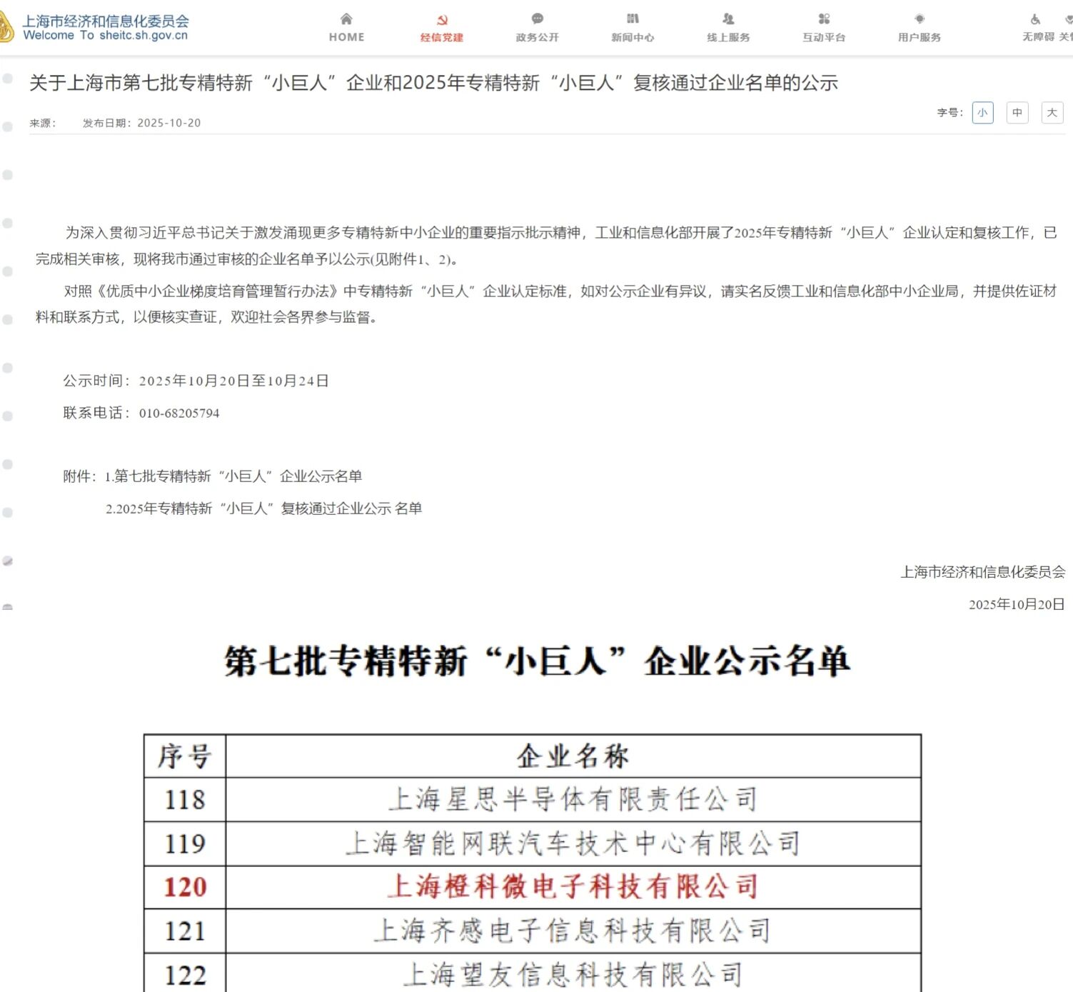 2025年10月20日,上海市經(jīng)濟和信息化委員會公示了第七批專精特新“小巨人”企業(yè)名單,上海橙科微電子科技有限公司憑借在高端芯片領域的硬核實力和創(chuàng)新水平,成功入選!