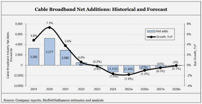 對于正處于"峰值痛苦期"的有線行業(yè),Moffett給出了相對樂觀的預(yù)測:"即使接近最壞情景,Comcast和Charter在未來五年左右也基本能保持用戶數(shù)持平,這與市場常見的末日論調(diào)相去甚遠(yuǎn)。"圖表數(shù)據(jù)顯示,美國有線運營商寬帶用戶流失量將逐年減少,并在2028年實現(xiàn)微弱增長。這一趨勢對近期遭遇銷售歷史性下滑的有線接入設(shè)備供應(yīng)商而言尤為積極。