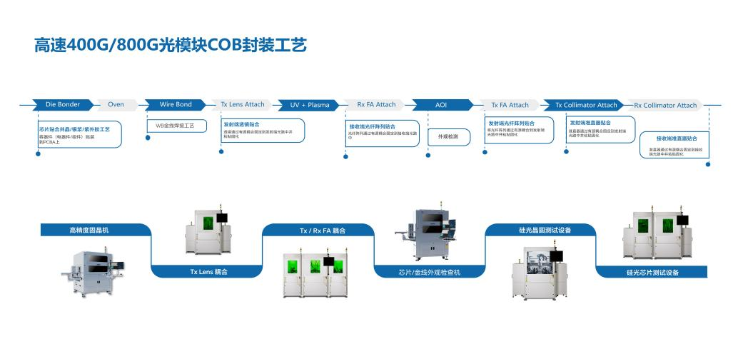 COB/COC工藝因其高集成、低損耗及低成本等優(yōu)勢被廣泛應(yīng)用于數(shù)據(jù)中心400G/800G高速光模塊制造。由于光模塊的封裝工藝復雜,特別是在固晶貼裝、Lens耦合、性能測試等環(huán)節(jié)存在一定的技術(shù)壁壘,固晶機作為高速光模塊制造的核心設(shè)備,其精度直接影響光模塊的性能、良率和生產(chǎn)效率,大部分的高端光模塊內(nèi)部核心激光器芯片貼裝精度控制僅允許±3μm之間,為后面的器件耦合工藝提供足夠、穩(wěn)定的對準誤差空間。