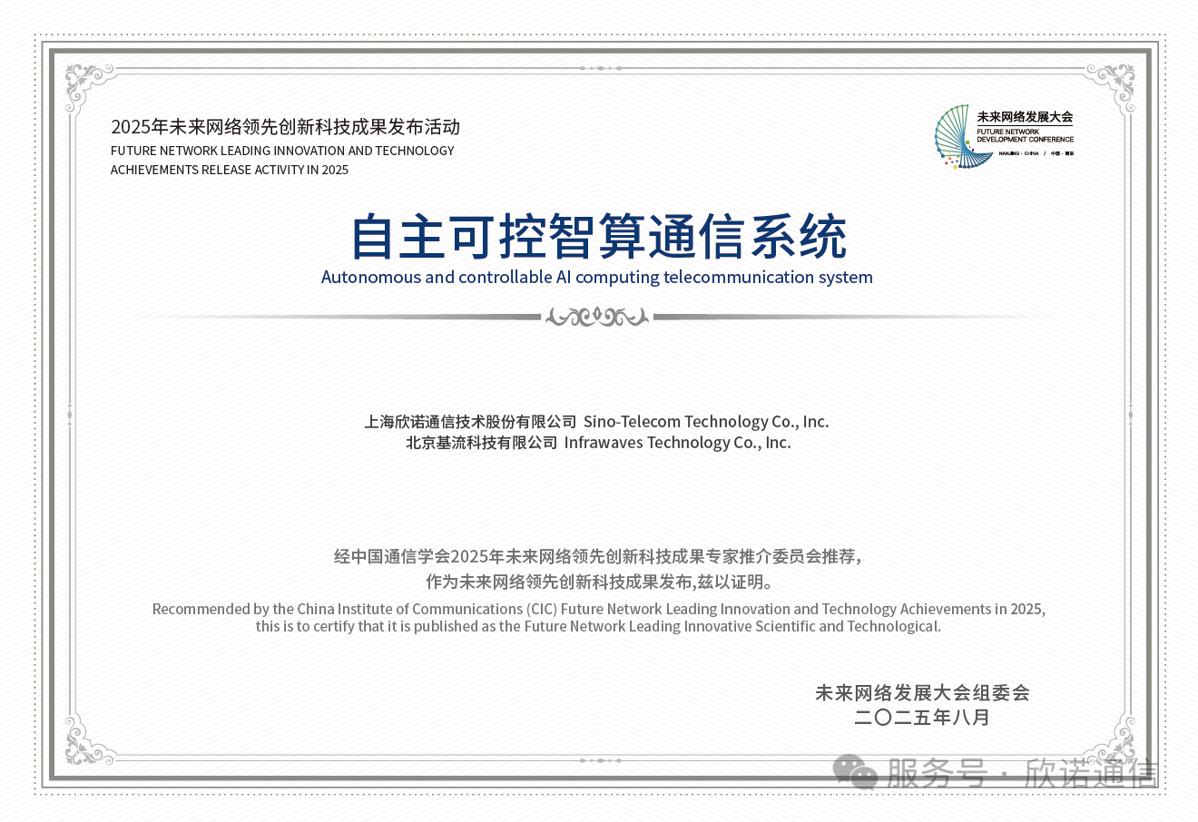 2025年8月21日,在南京上秦淮國際文化交流中心舉辦的第九屆未來網(wǎng)絡(luò)發(fā)展大會上,欣諾通信與基流科技聯(lián)合推出的“自主可控智算通信系統(tǒng)”榮獲“未來網(wǎng)絡(luò)領(lǐng)先科技創(chuàng)新成果獎”。該獎項充分肯定了其在國產(chǎn)化智算通信領(lǐng)域的技術(shù)創(chuàng)新。