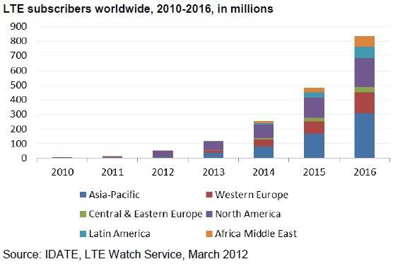 繼2009年底在斯德哥爾摩由TeliaSonera率先發(fā)動(dòng)和2010年第一次部署之后,2011年LTE得到加速發(fā)展。2011年底,超過900萬LTE用戶數(shù)雇傭超過30個(gè)全球網(wǎng)絡(luò),其中超過一半是美國Verizon無線客戶。4G生態(tài)系統(tǒng)正在迅速蔓延,超過200個(gè)移動(dòng)運(yùn)營商正在部署該技術(shù)。到2016年底,由于運(yùn)營商在長期的演化和真正4G、LTE-Advanced上的興趣,全球LTE用戶數(shù)可能超過8億。由于中國和印度TD-LTE、日本、韓國的發(fā)展,亞太地區(qū)將伴隨著巨大增長潛力,而美國市場競爭則日益激烈,Clearwire,Sprint和Dish已經(jīng)選擇在LTE上大力投資,2013年將開始在LTE-Advanced上投資。4G在歐洲的應(yīng)用較慢,隨著數(shù)據(jù)流量的迅速增長,移動(dòng)運(yùn)營商的投資只能一步步來。