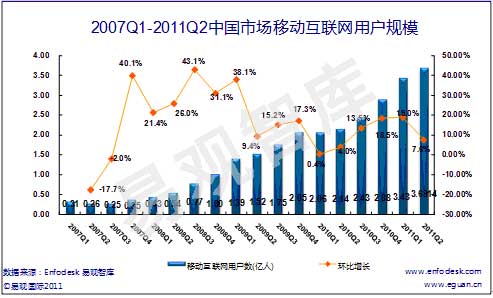 據(jù)易觀國際最新發(fā)布的數(shù)據(jù)顯示,2011年第2季度中國移動互聯(lián)網(wǎng)用戶規(guī)模達3.69億人,環(huán)比增長7.6%%,相比去年同期呈現(xiàn)72.3%增長速度。