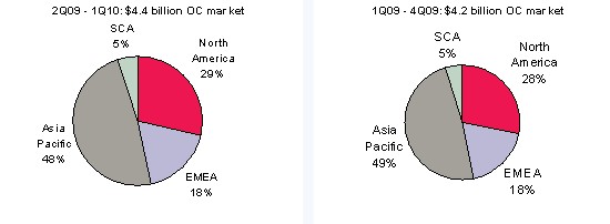 Ovum首次在市場占有率報(bào)告中納入?yún)^(qū)域分析預(yù)測——亞太區(qū)是成長最強(qiáng)勁的區(qū)域,占全球前四季營收的48%,部分原因來自代工制造商集中在這個(gè)區(qū)域。圖1顯示光學(xué)組件市場各區(qū)域的市場占有率。