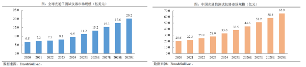 LightCounting預(yù)測2023年全球數(shù)通光模塊市場規(guī)模達(dá)62.5億美元,預(yù)計(jì)2029年將以27%CAGR增長達(dá)到258億美元。與光模塊市場增長曲線同步的是相配套光通信測試儀器市場。根據(jù)Frost&Sullivan數(shù)據(jù),2024年全球光通信測試儀器市場規(guī)模達(dá)到9.5億美元,預(yù)計(jì)2029年達(dá)到20.2億美元。其中,中國作為全球光通信產(chǎn)業(yè)最大板塊,其光通信測試儀器市場規(guī)模預(yù)計(jì)到2029年達(dá)到65.9 億元人民幣。