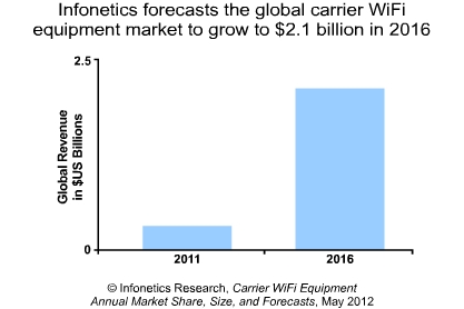 Infonetics預(yù)測,全球運營商WiFi設(shè)備市場將呈兩位數(shù)的高增長,到2016年爆增至21億美元。