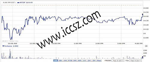 AFOP公司于2月2日公布了2010年第四季度和全年度的財(cái)務(wù)業(yè)績:第四季度AFOP的總收入為1163.8萬美元,比上季度總收入1327.6萬美元減少了163.8萬美元,而比去年同期總收入751.7萬美元增加了55%。截至2010年12月31日,AFOP全年總收入達(dá)4540.6萬美元,比上一年的2983.4萬美元增長了52%。 美國時(shí)間2月9日,AFOP收盤價(jià)為14.45美元,較前日的14.67美元略縮幅1.50%。