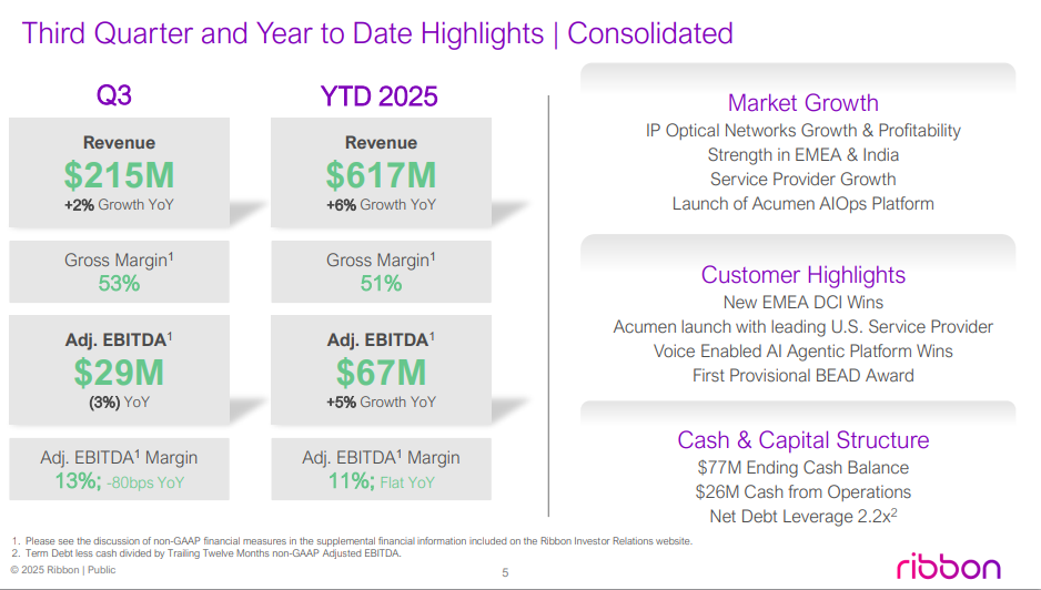 ICC訊 全球領(lǐng)先的實時通信技術(shù)與IP光網(wǎng)絡(luò)解決方案提供商Ribbon Communications公布了2025年第三季度財務(wù)業(yè)績。Ribbon第三季度營收為2.15億美元,同比增長2%,年初至今累計營收達6.17億美元,同比增長6%。