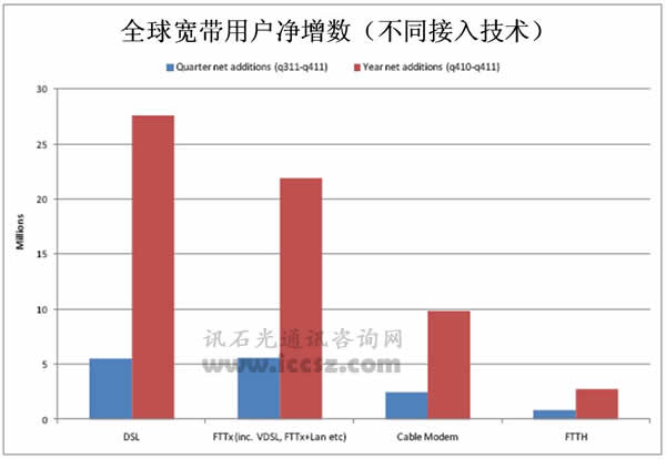 從接入技術(shù)來(lái)看,雖然DSL仍然是最流行的接入技術(shù),但其增速一直在放緩。2011年,DSL寬帶線路年凈增2756萬(wàn)線,比FTTx多560萬(wàn)線。不過(guò),這兩者之間的差距正在縮小,并且隨著FTTx寬帶線路的進(jìn)一步強(qiáng)勁增長(zhǎng),這種趨勢(shì)在2012年還將延續(xù)下去。事實(shí)上,在Q411,F(xiàn)TTx寬帶線路單季凈增數(shù)為559萬(wàn)線,是所有接入技術(shù)中最多的。2011年,全球FTTH寬帶線路凈增數(shù)為278萬(wàn)。