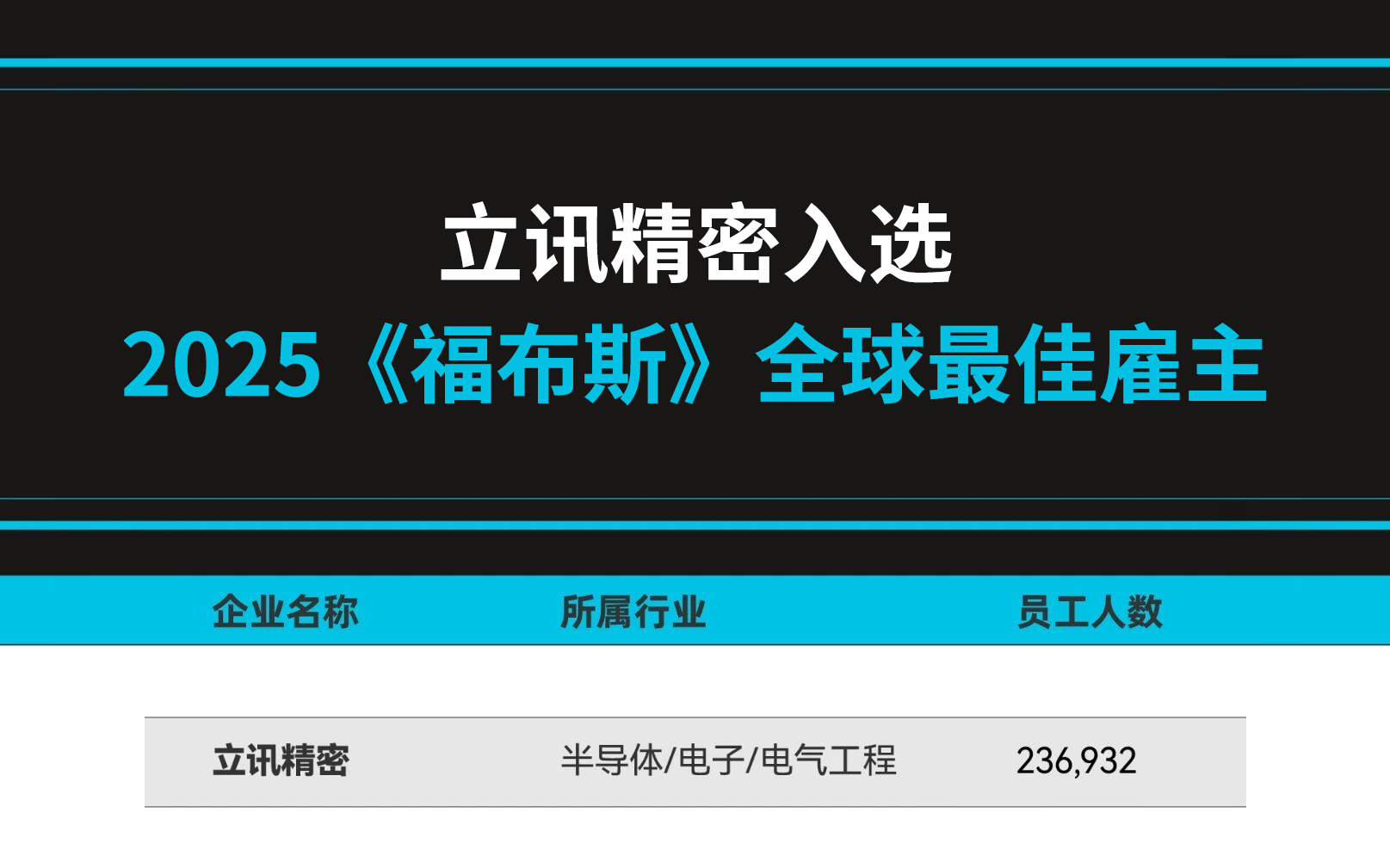 ICC訊 近日,全球權(quán)威財經(jīng)媒體《福布斯》正式發(fā)布 2025 年全球最佳雇主榜單,立訊精密成功入選。