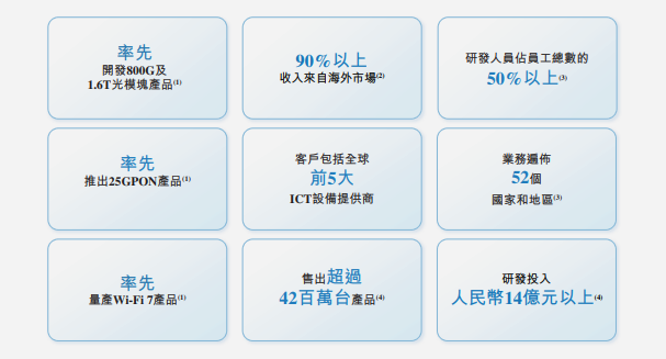 業(yè)務方面,劍橋科技是全球少數(shù)同時提供光通信、寬帶及無線技術相關連接解決方案的公司。在寬帶產(chǎn)品領域,公司的XGS PON產(chǎn)品在全球10GPON市場份額超過30%,并率先實現(xiàn)25GPON量產(chǎn)和50GPON部署。無線產(chǎn)品方面,公司全球首發(fā)Wi-Fi 7產(chǎn)品,并與Google Fiber合作推出業(yè)界首款20G上行Wi-Fi 7網(wǎng)關。光模塊產(chǎn)品覆蓋100G至1.6T互連速度,是全球首批部署800G和1.6T光模塊產(chǎn)品的企業(yè)之一。