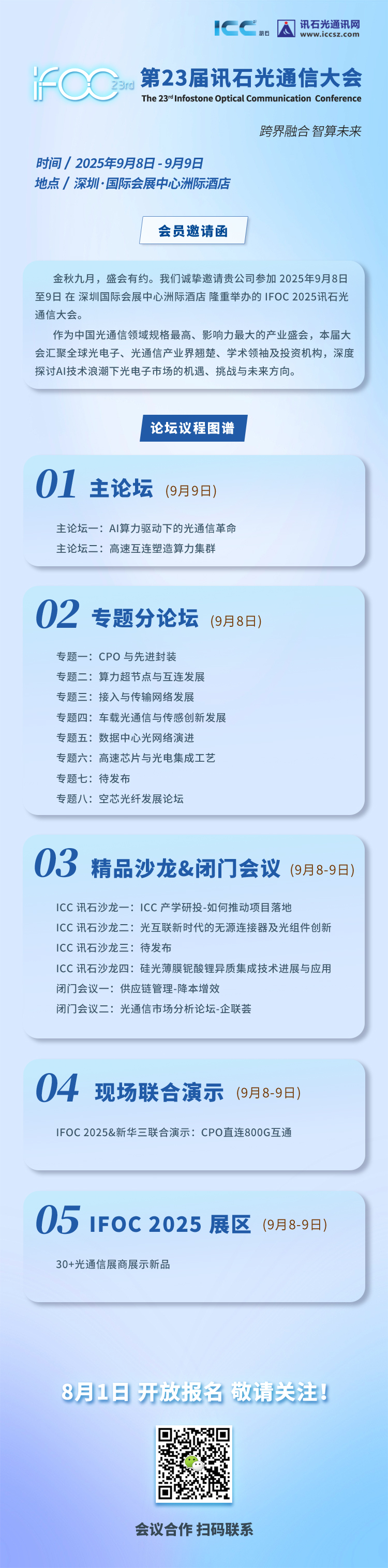 ICC訊 2025年9月8-9日,一年一度IFOC2025訊石光通信大會(huì)即將在深圳國(guó)際會(huì)展中心洲際酒店隆重舉辦。IFOC 2025定位中國(guó)光通信領(lǐng)域最高規(guī)格技術(shù),市場(chǎng),交流研討為一體的產(chǎn)業(yè)盛會(huì),將攜手光電子、光通信產(chǎn)業(yè)界、學(xué)術(shù)界、投資界等合作伙伴,探索AI機(jī)遇趨勢(shì)中的光電子技術(shù)市場(chǎng)的機(jī)遇與挑戰(zhàn),致力于成為光通信、光電子市場(chǎng)發(fā)展的風(fēng)向標(biāo)。