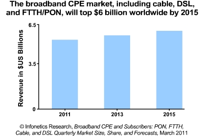 *全球?qū)拵в脩艚K端設(shè)備市場,包括DSL、電纜和FTTH設(shè)備,在2010年達到52億美元,預計該市場到2015年將增長至60億美元。