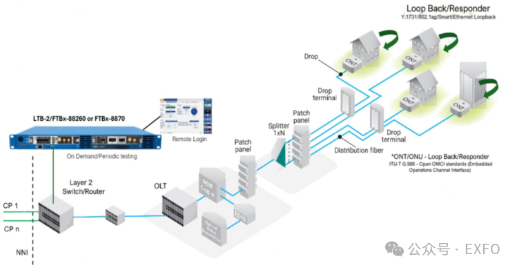 IEEE 802.1ag和ITU-T Y.1731等標準定義了支持二層環(huán)回、連續(xù)性檢查及丟幀測量的OAM功能。這些OAM功能為故障隔離和連接性能驗證提供了寶貴的洞察力,而線速吞吐量測試通常需要在ONT/ONU層進行以太網(wǎng)環(huán)回。通過結(jié)合兩種方法,寬帶運營商可遠程啟動并管理從NNI到ONT的測試,從而模擬真實的服務(wù)流量以驗證端到端連接性能、故障隔離及SLA指標——無需現(xiàn)場人員部署,按需完成。