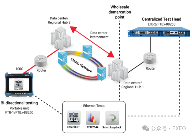該配置使其能夠維持至批發(fā)分界點的接入測試,同時將可視性擴展到傳輸域。在一些用例中,遠端部署第二臺FTBx-88260測試設(shè)備,實現(xiàn)數(shù)據(jù)中心互聯(lián)的全雙向測試。