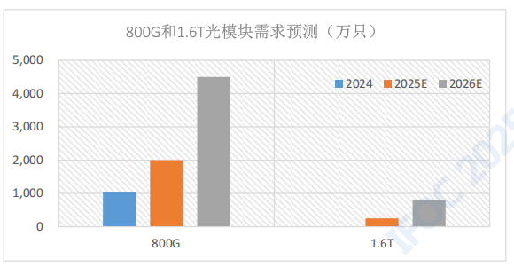 關(guān)于2026年需求方面,據(jù)IFOC2025訊石光通信大會上,ICC訊石產(chǎn)研院發(fā)布報告估測,2026年800G需求約4500萬只,相比2025年翻倍;其中,NV GPU配套約2000萬只,ASIC帶來的增量2000萬只。這一數(shù)字為明年的發(fā)展