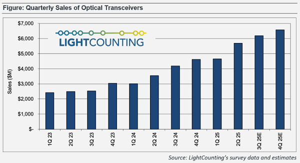 根據(jù)LightCounting(LC)發(fā)布的季度市場(chǎng)更新報(bào)告,2025年全球光收發(fā)器(光模塊)及相關(guān)產(chǎn)品市場(chǎng)取得前所未有的強(qiáng)勁增長(zhǎng)。預(yù)計(jì)2025年全年銷售額超過(guò)230億美元,較2024年大幅增長(zhǎng)50%。其中,數(shù)據(jù)中心以太網(wǎng)光模塊銷售額達(dá)到170億美元,較去年增長(zhǎng)60%。有源光纜(AOC)預(yù)計(jì)2025年銷售額超過(guò)11億美元,較2024年翻一番。