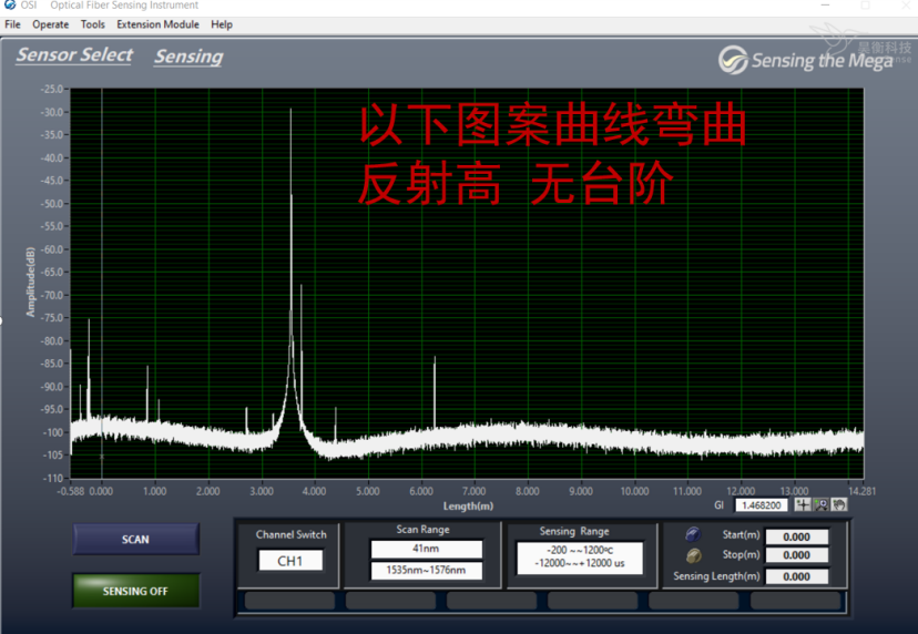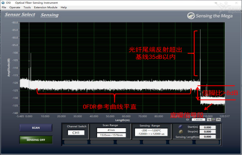 如下圖1所示為正常OFDR曲線,參考曲線筆直、平滑,尾端反射與參考曲線差值在35dB以內(nèi),并且底噪信號(hào)與參考曲線差值大于8dB,曲線長度與實(shí)際長度相同。