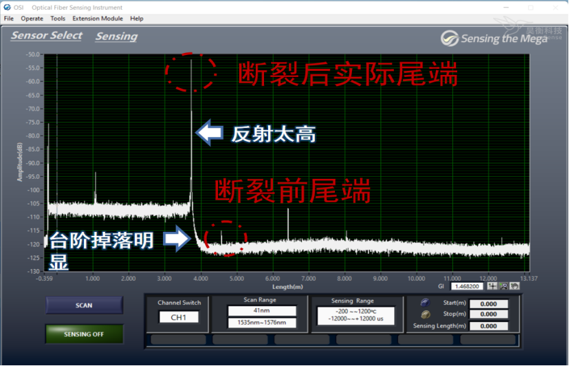 光纖斷裂后曲線,會(huì)出現(xiàn)測試長度與實(shí)際長度不符,斷裂處出現(xiàn)高反射。