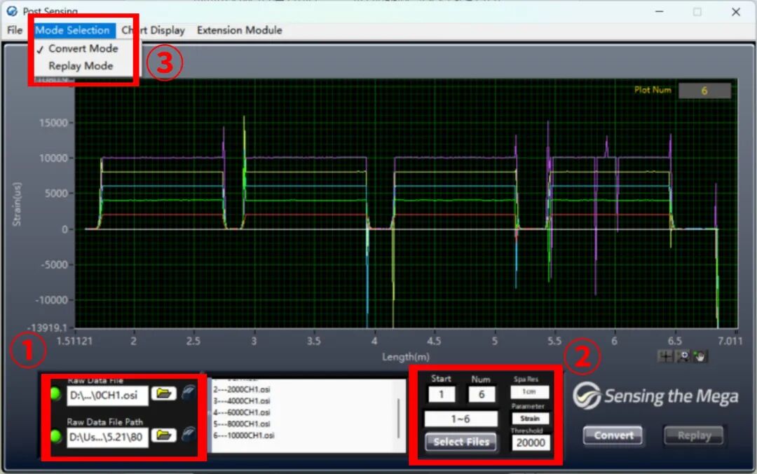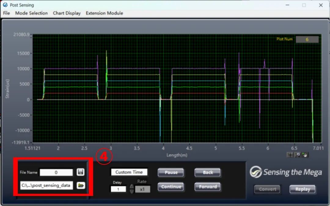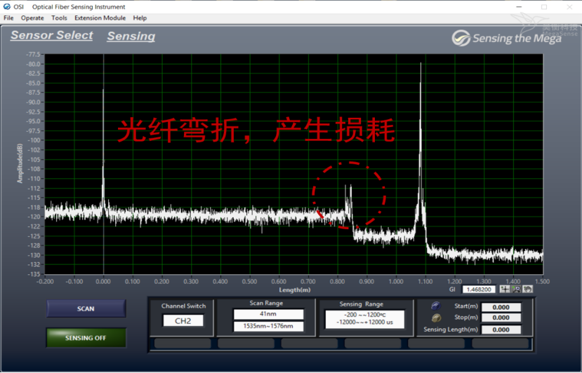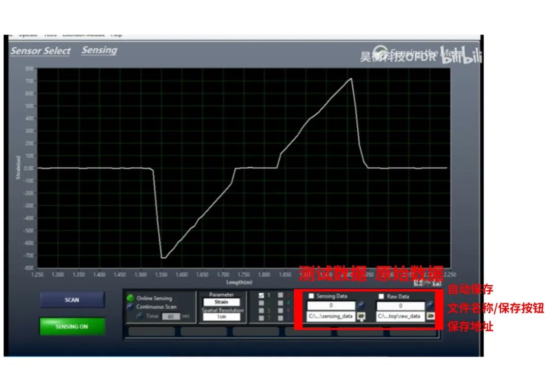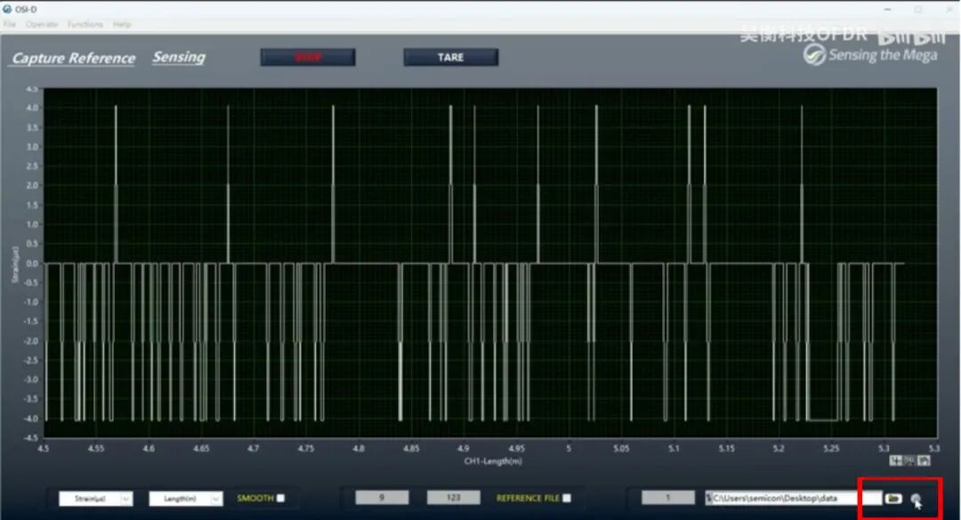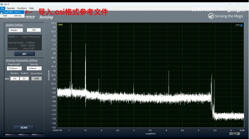 打開OSI-D軟件,設(shè)置通道數(shù)、長度和模式,點(diǎn)擊SCAN出現(xiàn)OFDR曲線,設(shè)置傳感段和空間分辨率后再次點(diǎn)擊Scan完成參數(shù)設(shè)置,點(diǎn)擊Sensing進(jìn)入傳感界面,點(diǎn)擊Start后軟件將自動(dòng)保存參考至桌面Data文件夾中,如有多組參考文件需要保存,記得每次保存一組參考文件后及時(shí)拷貝留存,避免下次保存參考時(shí)覆蓋數(shù)據(jù)。