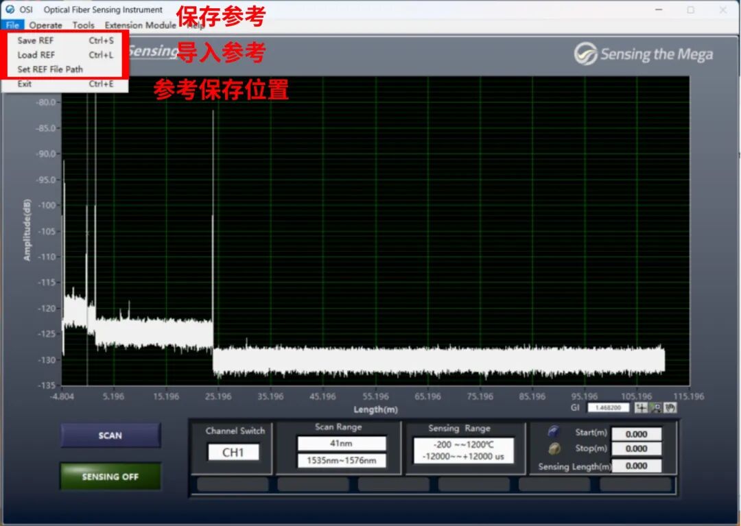 打開OSI-S軟件,點(diǎn)擊SCAN出現(xiàn)OFDR曲線,若以當(dāng)前狀態(tài)為參考進(jìn)行測試,①設(shè)置傳感段長度②設(shè)置參考保存位置③保存參考。