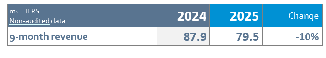 2025年前三季度,累計營收7950萬歐元,同比下降10%(按固定范圍和匯率計算為-11%)。Olfeo在此期間貢獻210萬歐元。