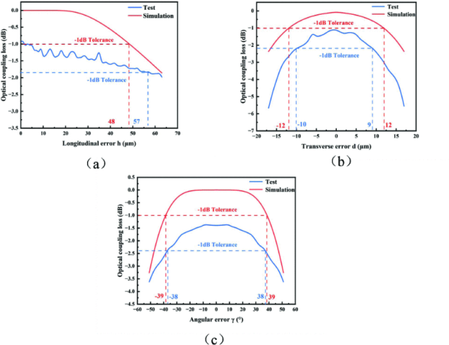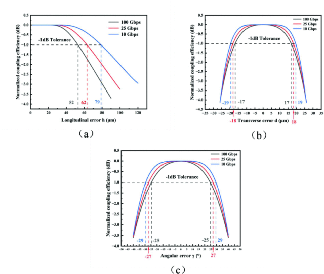 光耦合過(guò)程中的對(duì)準(zhǔn)誤差直接影響耦合效率。研究表明,100 Gbps VCSEL的光束發(fā)散角較大(30°),因此對(duì)對(duì)準(zhǔn)精度的要求極為苛刻。仿真結(jié)果顯示,在-1 dB損耗條件下,100 Gbps VCSEL需要的對(duì)準(zhǔn)精度為: