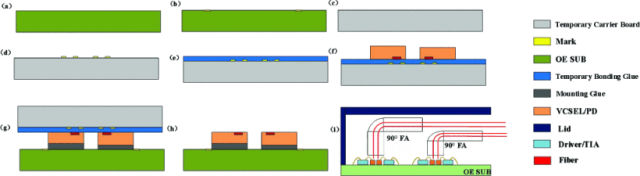 為了解決傳統(tǒng)組裝工藝中的精度不足問(wèn)題,研究團(tuán)隊(duì)提出了一種基于臨時(shí)載體的高精度組裝工藝。該工藝通過(guò)“臨時(shí)鍵合-轉(zhuǎn)移貼裝-可控拆卸-鍵合”三階段協(xié)同控制,使用與光學(xué)芯片熱膨脹系數(shù)匹配的硅片作為臨時(shí)載體,并采用低公差固態(tài)臨時(shí)鍵合膠和低模量流動(dòng)性貼裝膠。