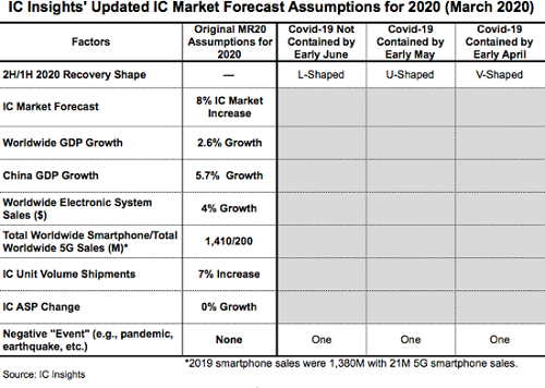 IC Insight分別針對(duì)若是疫情在四、五、六月受到控制,IC市場(chǎng)會(huì)有相應(yīng)的發(fā)展曲線。若疫情在四月受到控制,IC的銷售會(huì)呈現(xiàn)V型巨烈攀升;五月則以U型回升;但若延宕至六月疫情才減緩,IC市場(chǎng)可能就會(huì)走向L型,難以回復(fù)成長(zhǎng)率的趨勢(shì)。
