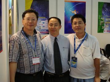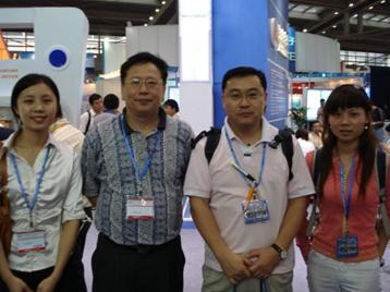 石總與華潤通總經(jīng)理鐘文欽(左二)、上海上詮副處長韓鳳永(右一)在上海上詮展臺前合影