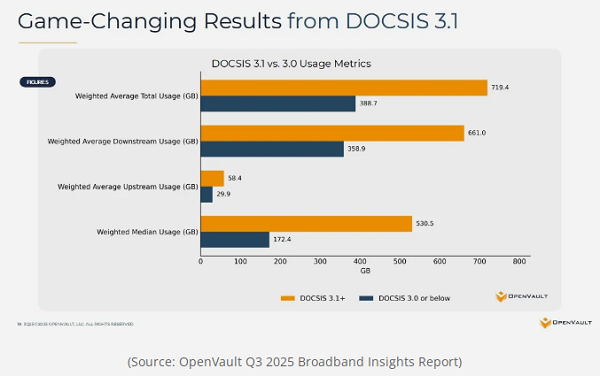 基于來自超過10萬個(gè)D3.1和D3.0家庭的匿名數(shù)據(jù),OpenVault發(fā)現(xiàn),使用DOCSIS 3.1服務(wù)的客戶加權(quán)中位數(shù)使用量現(xiàn)已超過其前代技術(shù)的三倍——D3.1為530.54 GB,而D3.0為172.43 GB。加權(quán)平均值也顯示D3.1和D3.0之間存在明顯差距。