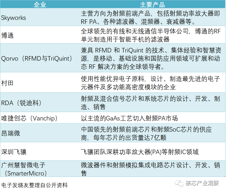PA(功率放大器):手機(jī)中除主芯片外最重要的外圍元件之一,影響著手機(jī)的信號(hào)強(qiáng)度、通信質(zhì)量以及基站效率。95%由歐美廠商主導(dǎo),國(guó)內(nèi)則有漢天下、中普微、RDA等一批PA優(yōu)秀廠商。