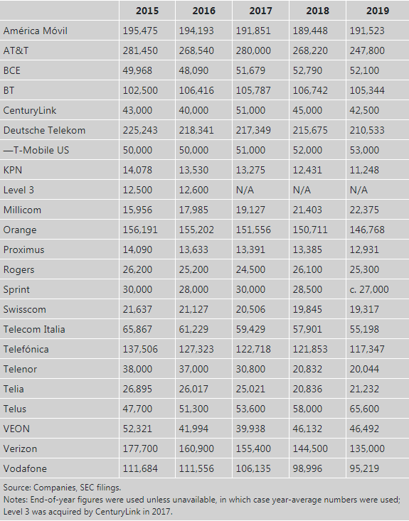 在此期間,美國和歐洲的主要運(yùn)營商都沒有增加員工數(shù)量,除了AT&T之外,還有一些大公司的裁員力度也很大。自2015年以來,Verizon已裁員4.27萬人,占總數(shù)的近四分之一。德國電信同期裁員近2萬人,約占員工總數(shù)的9%。
