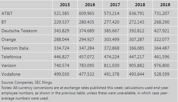 AT&T 2015年的人均收入為521,585美元,但在裁員數(shù)千人之后,去年這一數(shù)字躍升至731,207美元。在Verizon,這一數(shù)字同期從740,574美元上升到976,800美元。歐洲的一些大玩家也見證了增長,盡管沒有那么引人注目。德國電信的人均收入從2015年的343,829美元(按今天的匯率計(jì)算)增長到去年的427,921美元。活躍于許多低成本非洲市場的Orange,這一數(shù)字在此期間從288,044美元升至322,077美元。