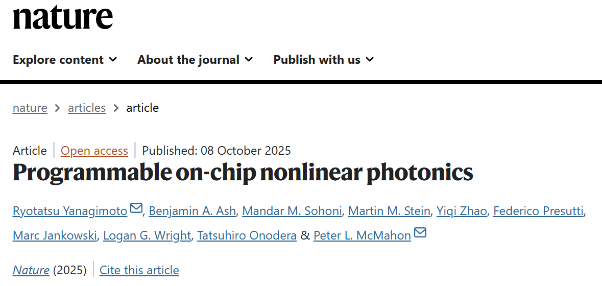 [1] R. Yanagimoto, B. A. Ash, M. M. Sohoni, M. M. Stein, Y. Zhao, F. Presutti, M. Jankowski, L. G. Wright, T. Onodera, and P. L. McMahon, "Programmable on-chip nonlinear photonics," Nature, Oct. 2025, doi: 10.1038/s41586-025-09620-9.