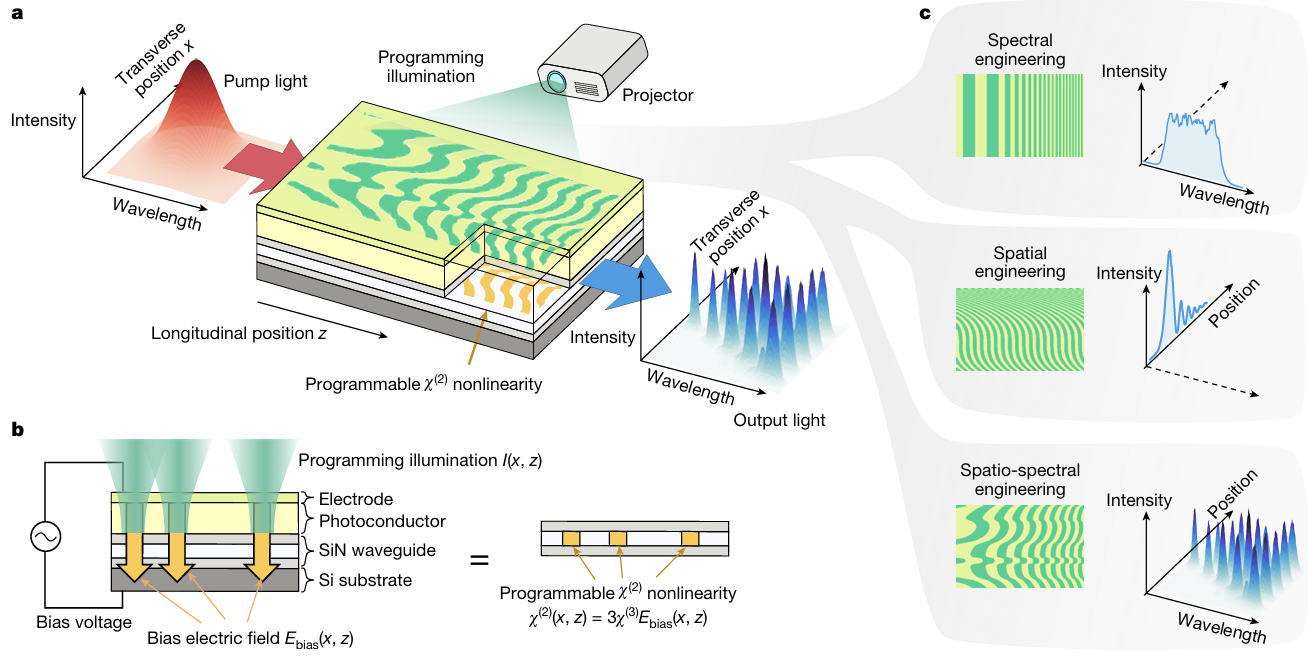 ICC訊 設(shè)想一個光子器件能夠瞬間在不同光學(xué)功能之間切換,實時適應(yīng)變化的條件或用戶需求。通過對可編程非線性波導(dǎo)的研究,這一愿景正在逐步實現(xiàn)。研究人員展示了對光與物質(zhì)在芯片上相互作用方式的精確控制。這項發(fā)表在《自然》期刊上的工作,標(biāo)志著非線性光學(xué)從長期以來"一個器件一種功能"模式的根本轉(zhuǎn)變。