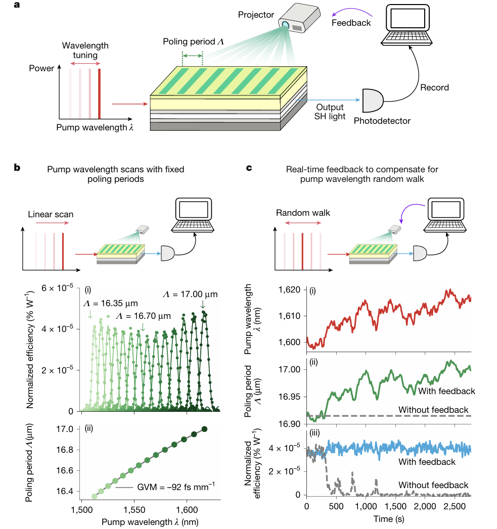 圖2:使用可編程非線性波導(dǎo)進(jìn)行實時可編程周期極化,展示反饋控制如何在泵浦波長隨機(jī)波動的情況下保持高轉(zhuǎn)換效率。