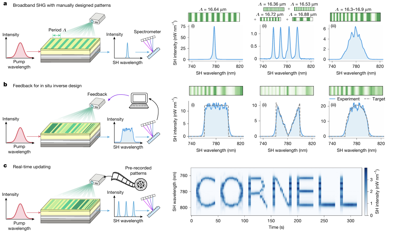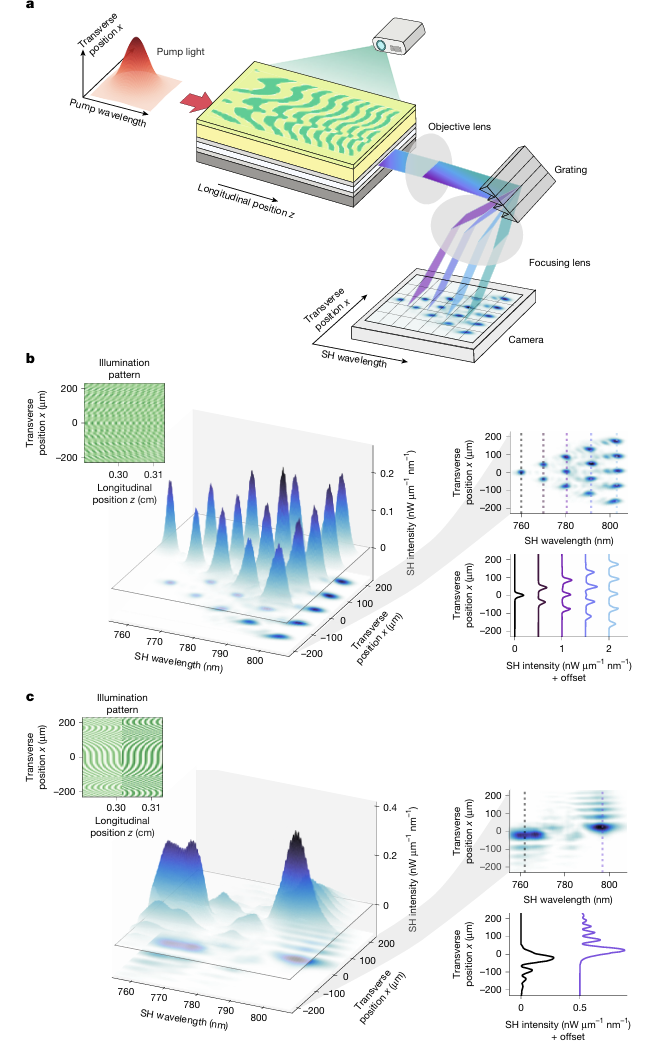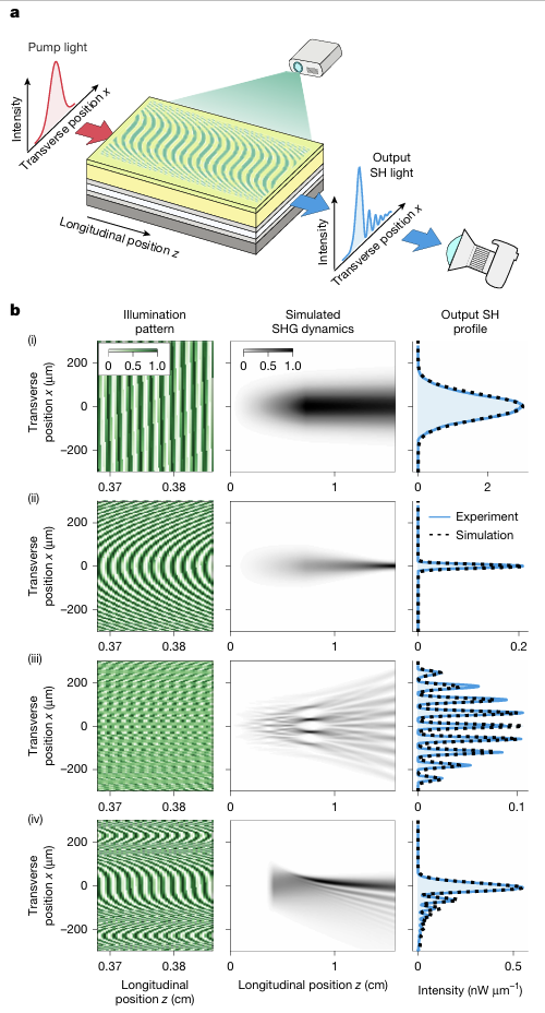 圖1:可編程非線性波導(dǎo)的工作原理和功能,說明結(jié)構(gòu)光投射到器件表面如何編程非線性圖案,從而實現(xiàn)對二次諧波產(chǎn)生的多功能控制。