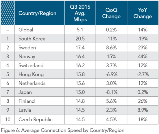 ICCSZ訊 全球領(lǐng)先的內(nèi)容分發(fā)服務商(CDN)Akamai昨日發(fā)布了《2015年第三季度互聯(lián)網(wǎng)狀況報告》。報告顯示,今年第三季度全球平均網(wǎng)速同比增長14%至5.1Mbps,但至少擁有25Mbps網(wǎng)速的用戶僅占全球人口的5.2%。