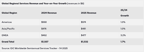 ICC訊 根據(jù)國際數(shù)據(jù)公司(IDC)《全球半年度電信服務(wù)追蹤報告》,2025年全球電信和付費(fèi)電視服務(wù)支出將達(dá)到1.532萬億美元,同比增長1.7%。與今年早些時候的預(yù)測相比,此次最新預(yù)測略顯樂觀,因預(yù)計市場總值增長率將高出0.1個百分點(diǎn)。