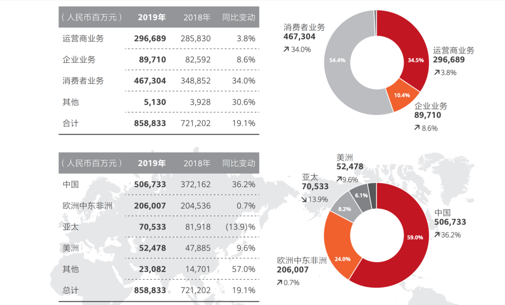 以2019年為例,華為全年銷售收入為人民幣8588億元,同比增長(zhǎng)19.1%。在這一年,消費(fèi)者業(yè)務(wù)占總營(yíng)收比例首次超50%,而2018年以前,運(yùn)營(yíng)商業(yè)務(wù)才是華為收入占比最高的業(yè)務(wù)。